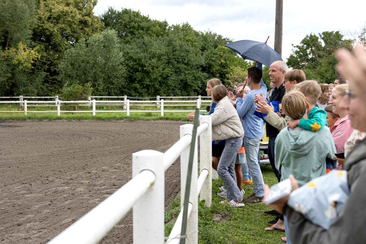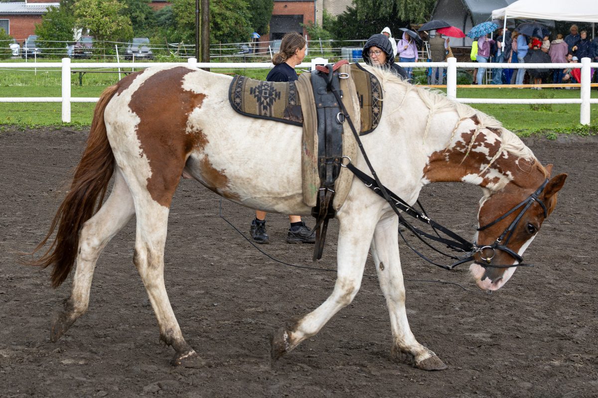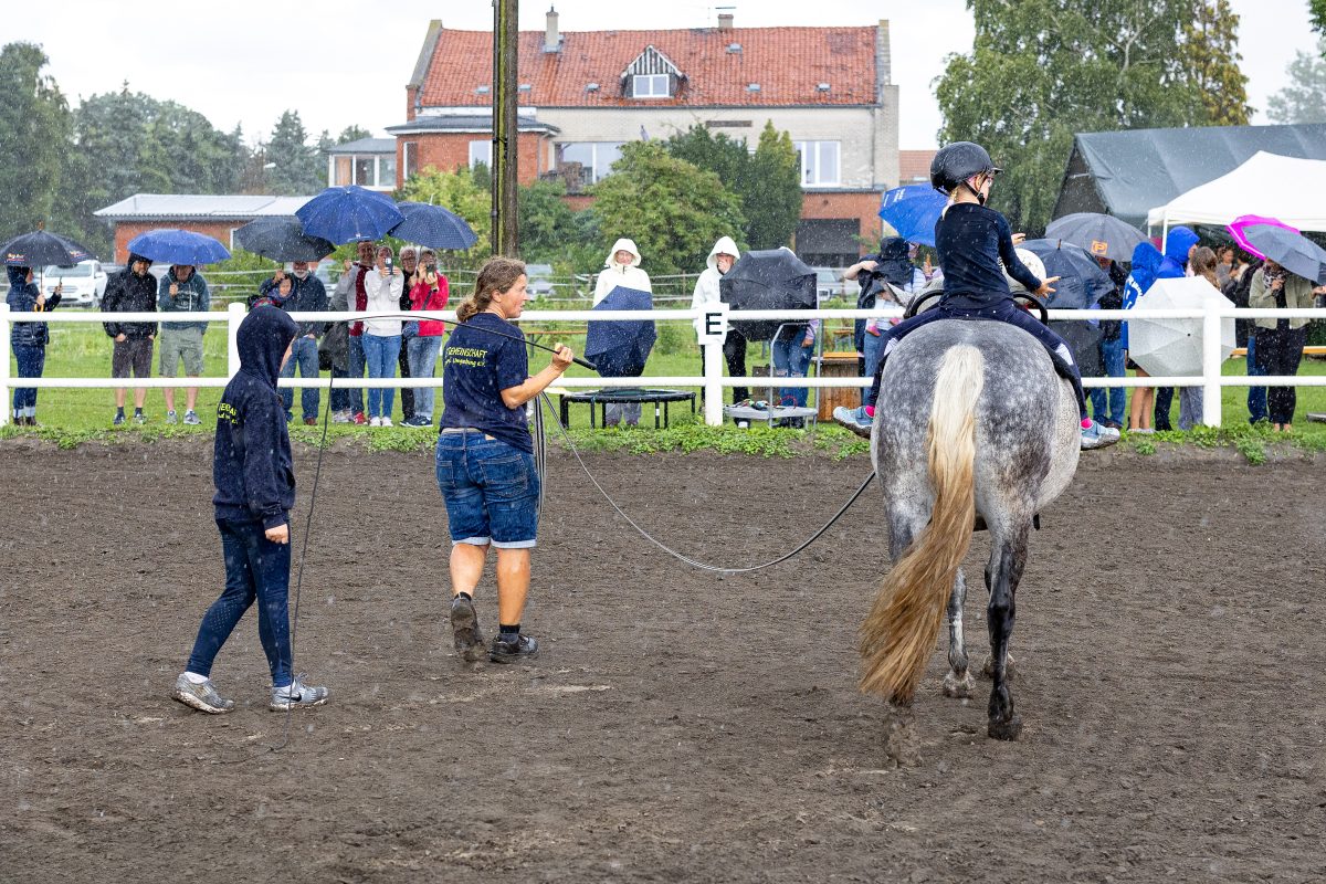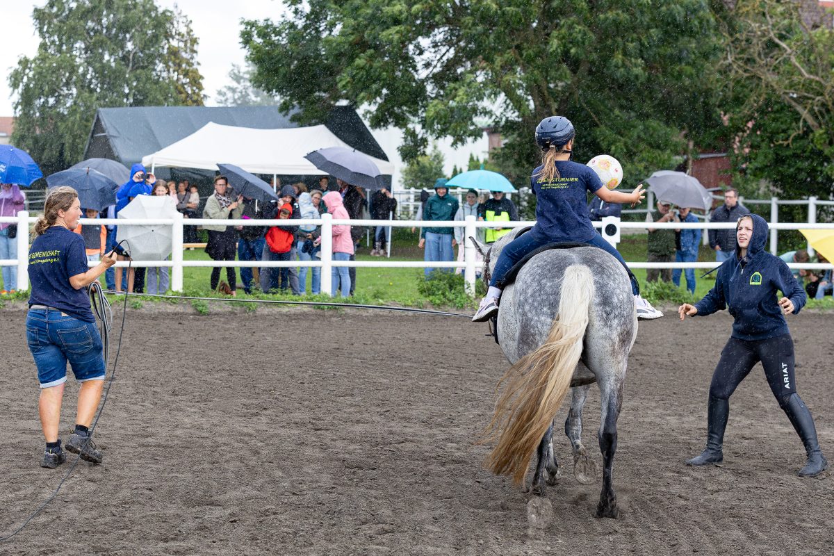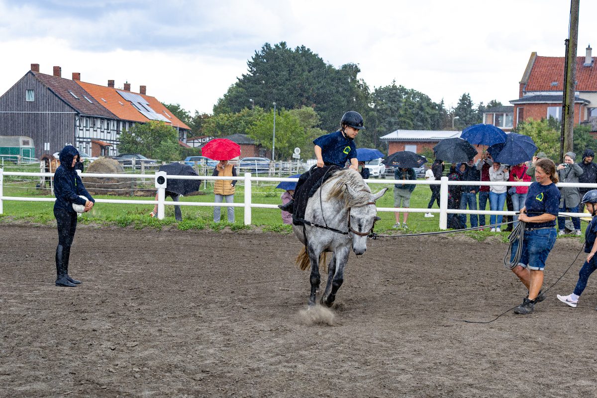 Am Tag der Vorstellung zeigte sich das Wetter nicht ganz so beständig, ein heftiger Regenschauer führte dazu, dass die Vorstellung kurz nach Beginn in die Reithalle verlegt werden musste. Für Jani und ihrem Team, die alles richtig gut im Griff hatten, war das kein Problem. Der Hallenboden wurde schnell befeuchtet und schon ging es weiter mit der spannenden Show.